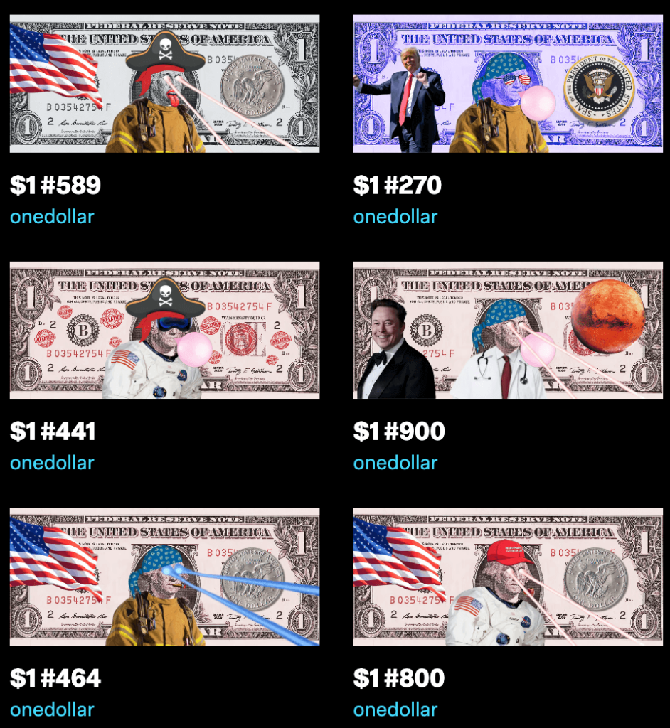 Own a unique piece of the $1 NFT collection and directly support the $1 movement! All proceeds from sales and royalties fund marketing for the $1 meme coin, driving the mission to surpass the $1 value.